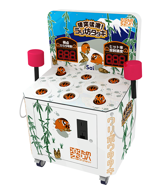 リハビリサポートマシン『猪突猛進!うり坊タタキ』は、脳活性と上肢運動機能の維持向上を目的に開発された『ハンマーフロッグ』の進化版。主な特徴は従来品同様利用者の状態に合わせ、叩いた回数と時間により、後半のペースを自動調整。また表示機能も得点に加えヒット率や反射速度、カラダ年齢を表示。利用者の向上心と継続意欲を刺激します。利用者の安全に配慮し、座ったまま行います。